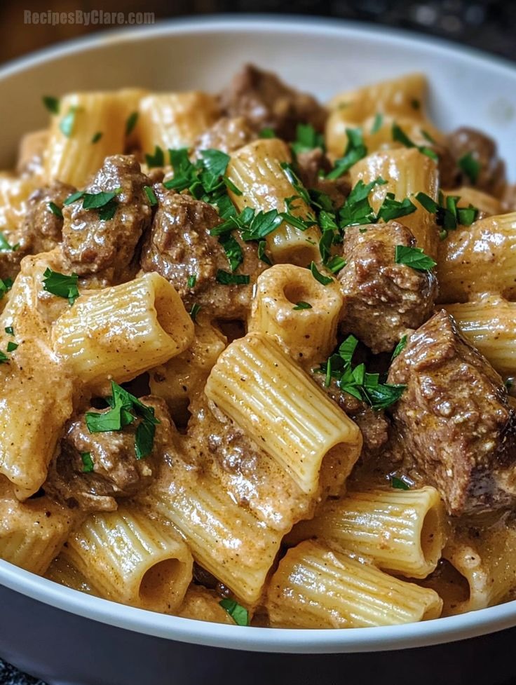 Enjoy a savory dinner with this Creamy Parmesan Beef with Rigatoni Pasta. Tender beef, rigatoni, and a rich, creamy Parmesan sauce make this a perfect meal.