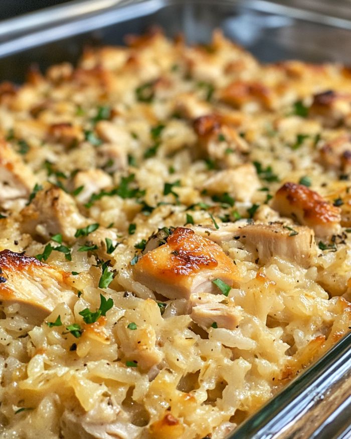 This baked creamy chicken and rice casserole is a comforting dish that combines tender chicken with creamy rice, all topped with a golden, crispy layer. It’s a classic American recipe, often found in homes across the Midwest, where convenience and heartiness meet in the kitchen. The creamy texture is achieved with a blend of broth and cream, and it’s a perfect one-dish meal that fits both weeknight dinners and family gatherings. The origins of this dish are deeply rooted in the desire for convenience without sacrificing taste, making it a timeless favorite.