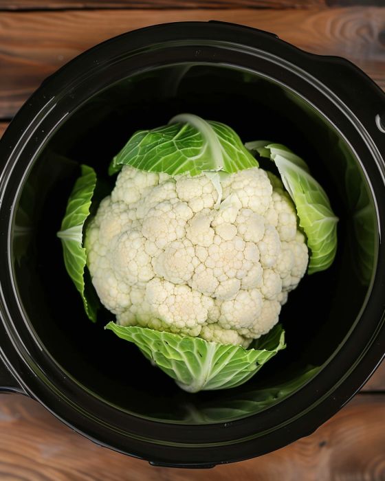 1. Clean the cauliflower by removing the outer leaves and trimming the stem to help it sit flat in the slow cooker.