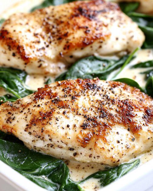 This pan-seared chicken with spinach and garlic cream sauce is a comforting dish that brings warmth to the dinner table. Originating from the classic combination of chicken and creamy sauces, this recipe is perfect for those evenings when you want to treat your family to something special without spending hours in the kitchen. The golden-brown crust on the chicken, paired with the earthy spinach and rich garlic cream sauce, makes it a delightful meal that even picky eaters will enjoy.