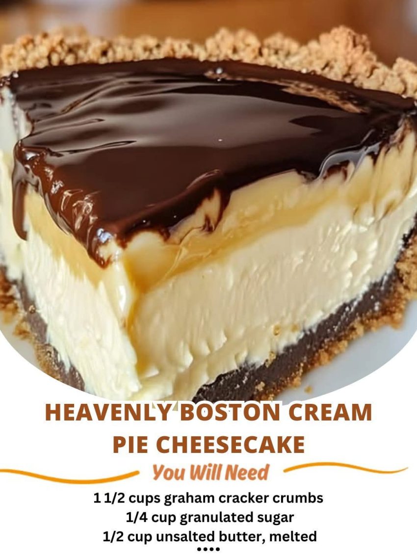 cheesecake and the iconic Boston Cream Pie. This decadent treat features a buttery graham cracker crust, a velvety vanilla cheesecake layer, a luscious custard filling, and a glossy chocolate ganache topping. Whether for special occasions or a luxurious weekend treat, this dessert is sure to impress!