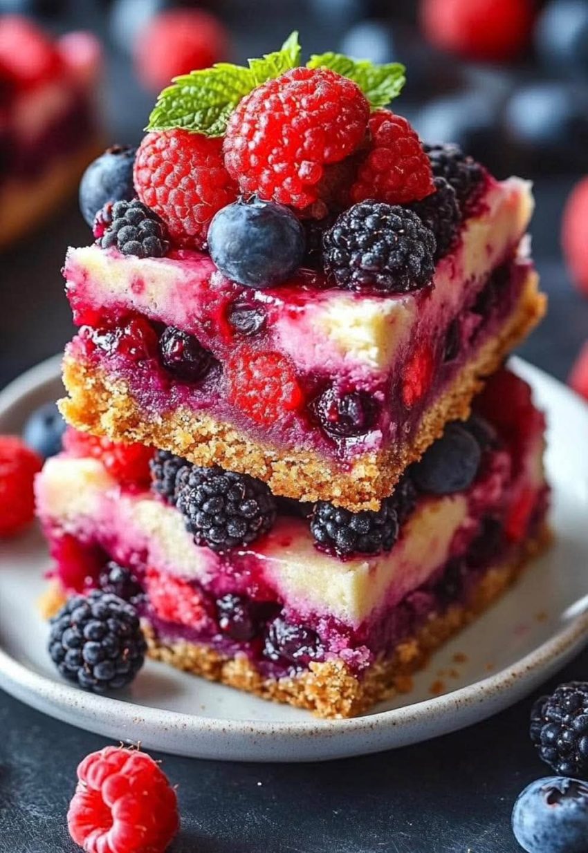 cheesecake, tart mixed berries, and a buttery graham cracker crust with these **Mixed Berry Crunch Cheesecake Bars**. This dessert is a delightful fusion of textures and flavors—smooth cheesecake, juicy berries, and a crunchy topping that makes every bite irresistible. Whether you’re serving them at a party, family gathering, or just treating yourself, these bars are sure to be a hit!