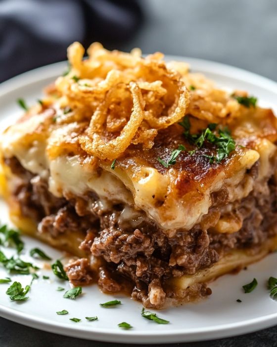 In the heart of the Midwest, where the winters are long and the fields stretch as far as the eye can see, comfort food is more than just a meal—it’s a way of life. This French onion beef and pasta casserole is a dish that brings together the rich, savory flavors of caramelized onions and tender beef, all nestled in a bed of pasta. It’s a recipe that harks back to simpler times, when families gathered around the kitchen table to share stories and laughter. This casserole is perfect for those chilly evenings when you need something hearty and warming. It’s a dish that reminds me of my grandmother’s kitchen, where the smell of onions cooking low and slow was a promise of good things to come.