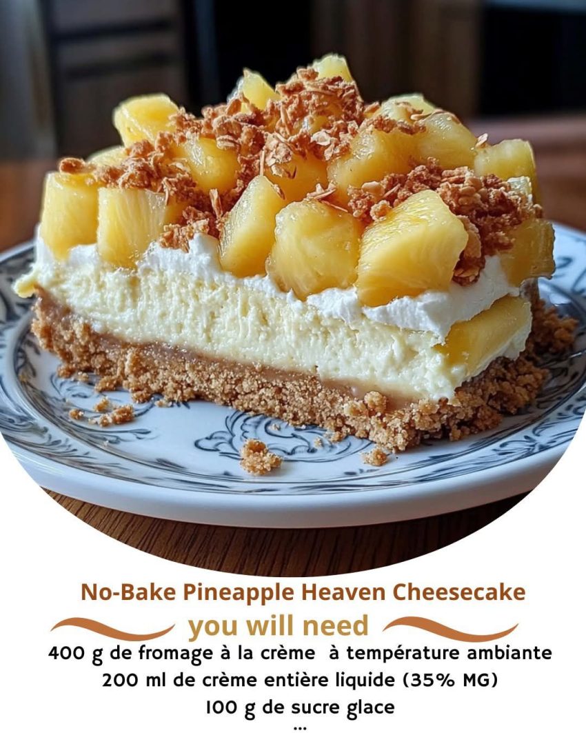 cheesecake requires no baking and sets beautifully in the fridge. With a buttery graham cracker crust and a velvety pineapple-infused filling, every bite is pure bliss!