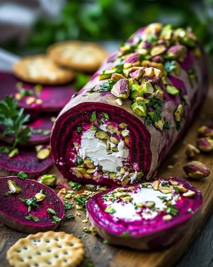A vibrant, elegant appetizer featuring creamy goat cheese, earthy roasted beets, and crunchy pistachios—perfect for entertaining or a gourmet