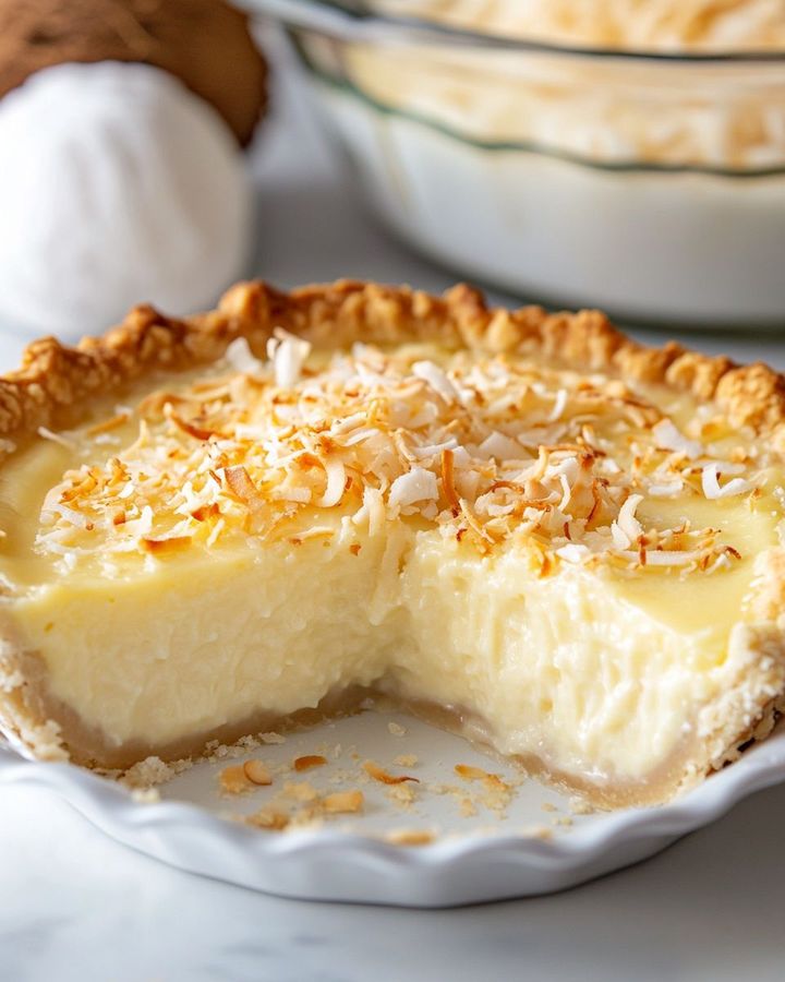 This delightful pie pairs beautifully with a side of fresh fruit, such as sliced strawberries or mangoes, which enhance the coconut flavor. A dollop of whipped cream or a scoop of vanilla ice cream on the side can make each slice even more indulgent. For a bit of contrast, try serving it alongside a slightly tart lemon sorbet. And of course, a cup of hot coffee or tea makes the perfect companion to each creamy bite.