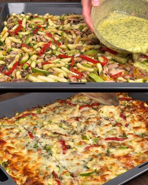- Pour the egg mixture evenly over the vegetables and chicken.