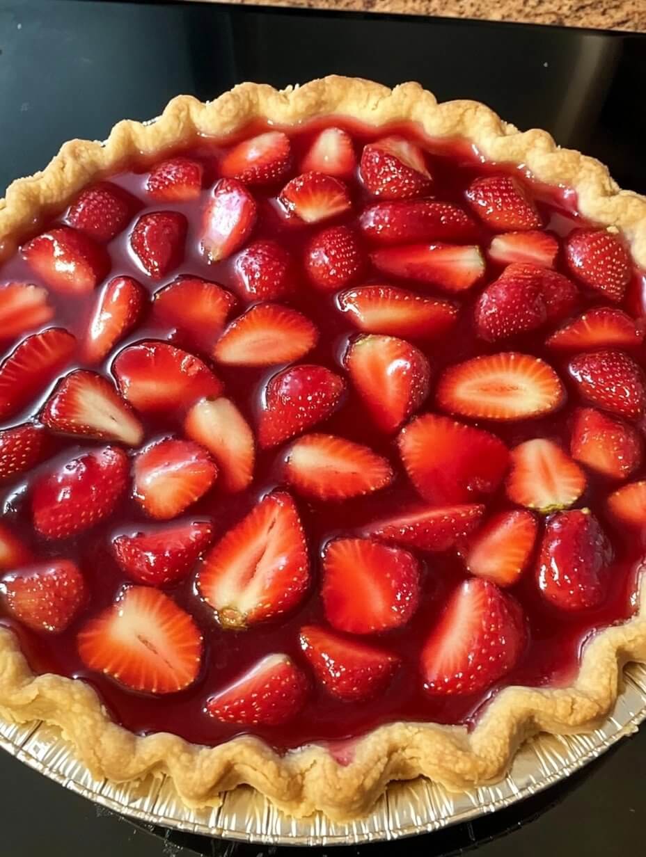 Add strawberries to the cooled pie crust, then pour over strawberry jelly mixture. Refrigerate for a few hours until set.