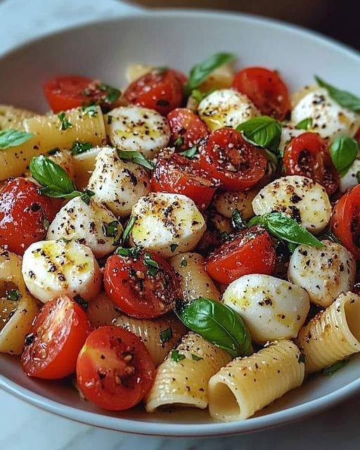 • In a large mixing bowl, combine the cooked pasta, cherry tomatoes, mozzarella, and chopped basil.