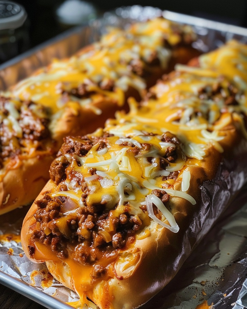 Assemble the Garlic Bread: Spread the sloppy joe mixture evenly over the prepared garlic bread halves. Top with shredded mozzarella and cheddar cheese.