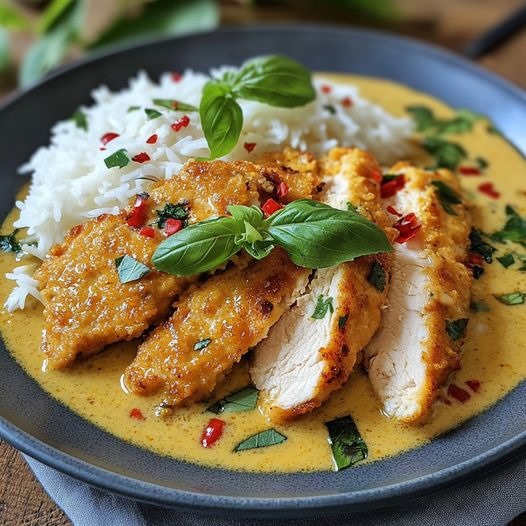 Sprinkle with curry and add a pinch of salt. Pour in the coconut milk and mix well.