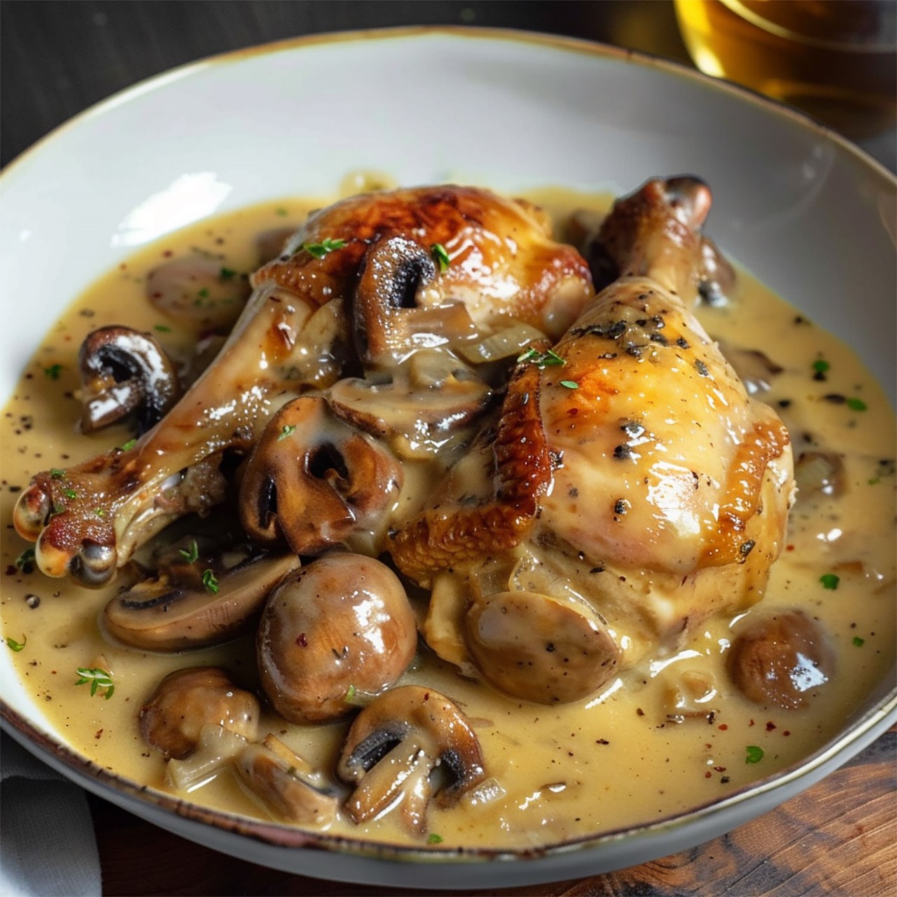 Enjoy this delicious chicken with Porto and mushrooms, a refined dish combining tender chicken and creaminess of a Porto sauce. Ideal for your dinners!