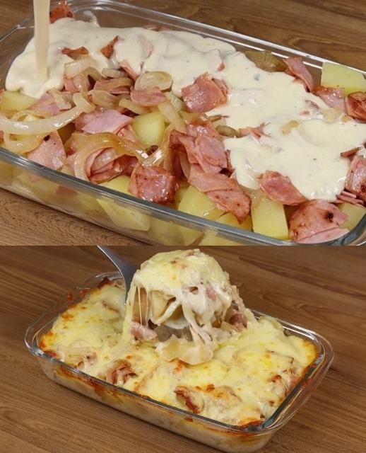 Pour the sauce over the potatoes, ham, and onion. Stir gently to combine.