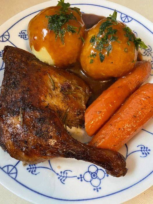 Arrange the baked duck legs on a plate with the dumplings and baked carrots. Garnish with fresh parsley or thyme, if desired.