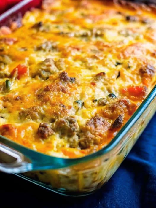 Spoon sausage mixture over the eggs and cream in the baking dish and then top with remaining cheese. Cover dish with foil and chill overnight.
