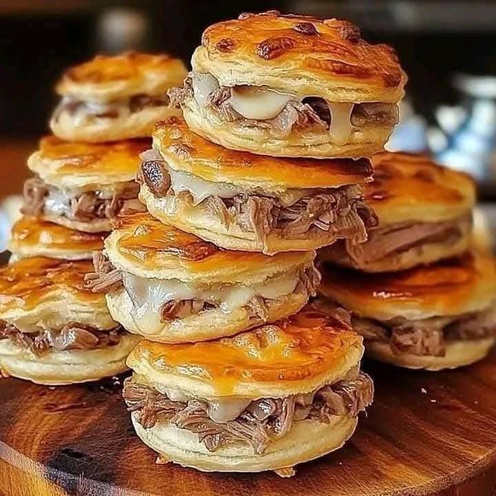 3. Top half of the biscuit layers with a slice of provolone cheese and roast beef. Top the meat and cheese with the remaining biscuit layers and pinch the edges to seal.