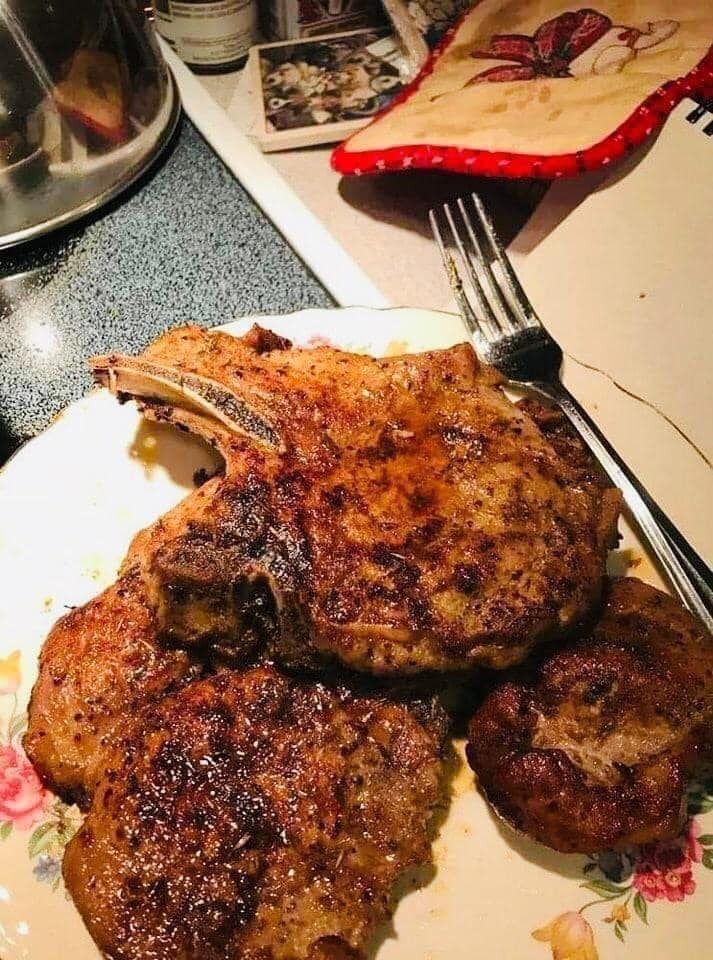 Remove the pan from the oven when the pork chops are done. Spoon over the butter sauce left in the pan.