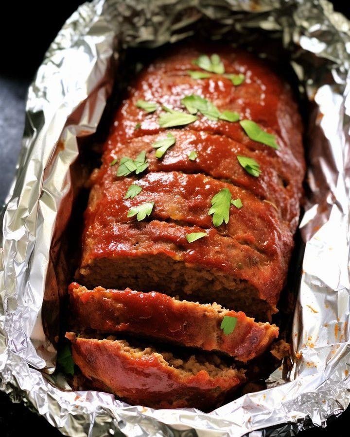 5. Once done, lift meatloaf out with foil overhang and top with 2/3 cup glaze. Put in broiler until glaze gets sticky.