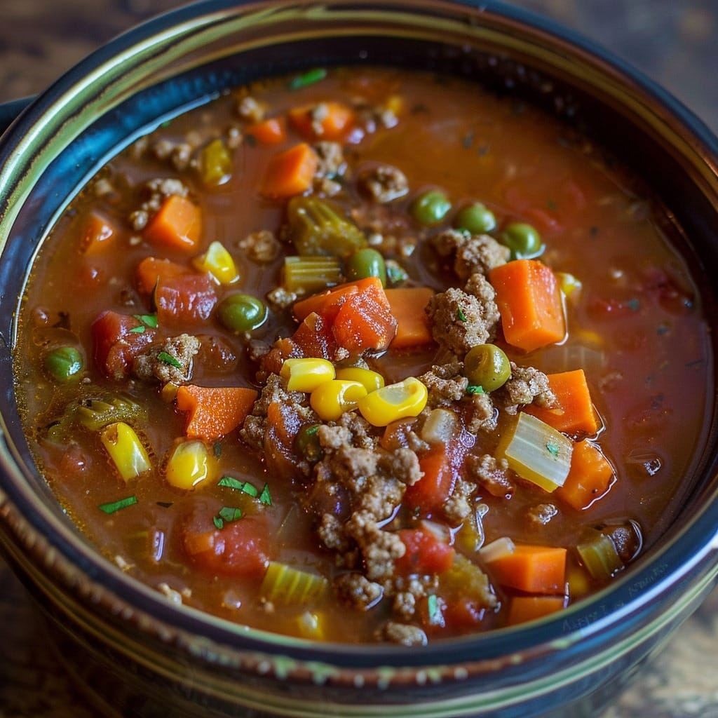 Add all cans of vegetables, can of tomato soup, and diced tomatoes. Salt and pepper to taste.
