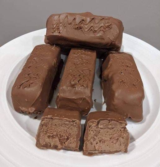 While the mixture is freezing, using a microwave safe bowl, combine the Lily’s baking chips and the “I Can’t Believe It’s Not Butter”. Microwave at 30 second intervals until completely melted and well blended. Allow to cool until it is barely warm to the touch, but still soft and fluid.