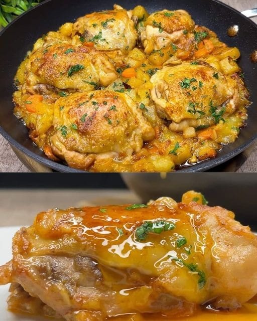 In a skillet, heat some olive oil over medium-high heat. Add the chicken thighs and cook until golden brown on both sides. Remove the chicken from the skillet and set aside.