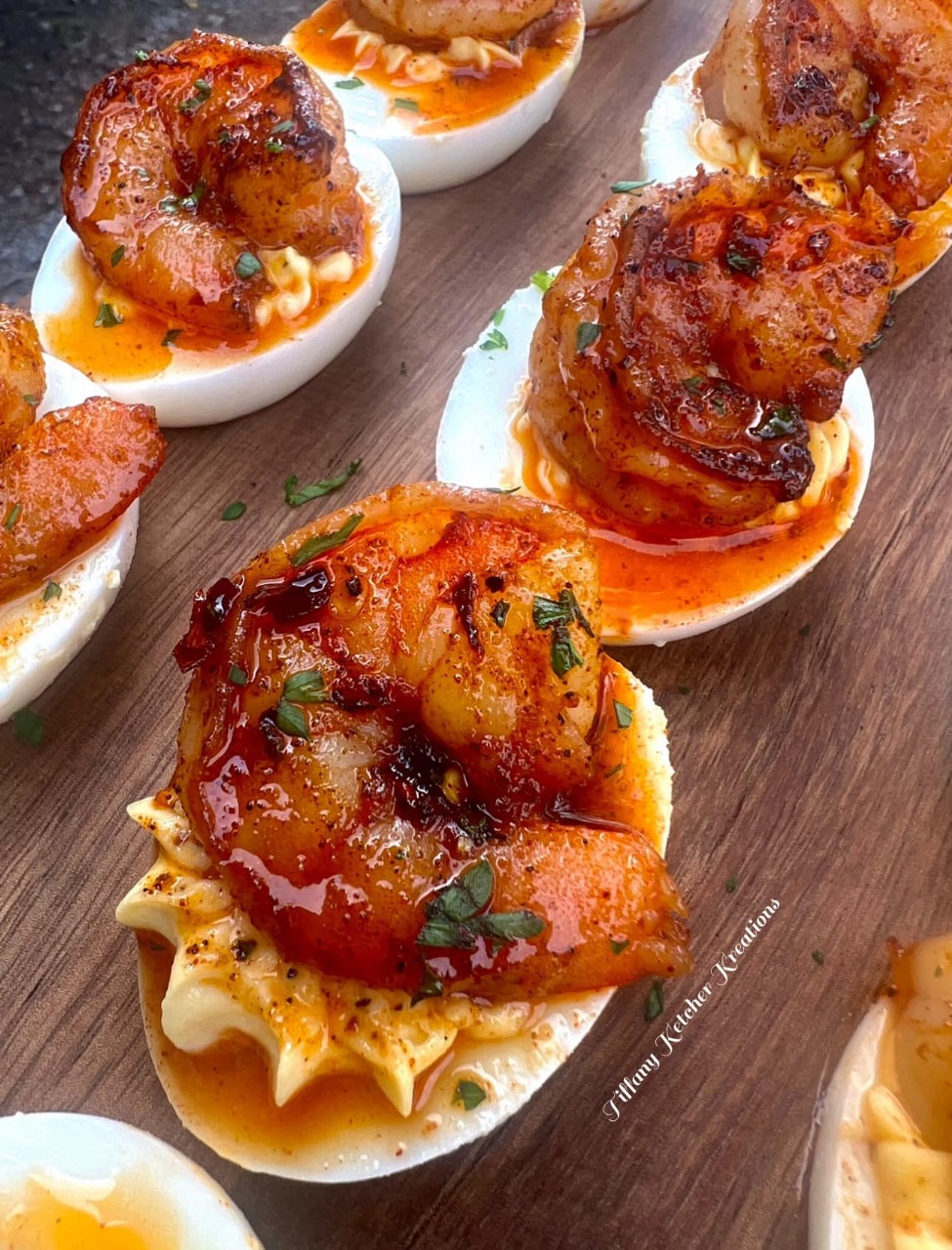 Add 2 tbsp oil over medium high heat and add shrimp Cook on each side 2 minutes or so until shrimp make a c shape. Add sauce and allow to thicken. Remove from heat and add to deviled eggs.