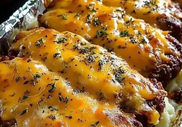 Enjoy this tasty meatloaf with mashed potatoes and cheese!