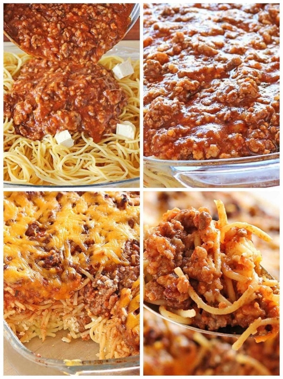 Place half the slices of butter in a 9×13 baking dish. Spread half the spaghetti in dish, then spread cheese mixture evenly over spaghetti.