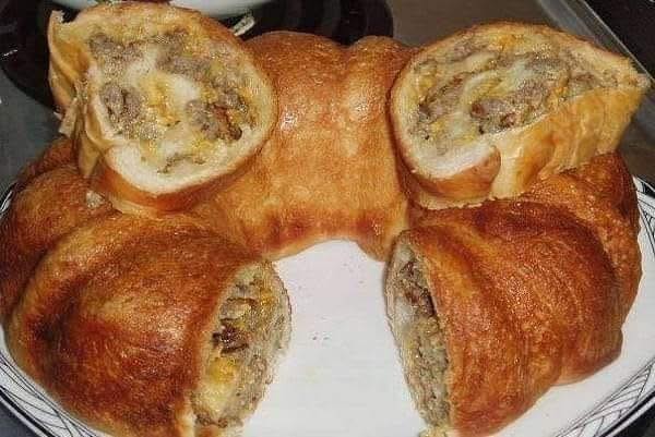 Spread the cooled sausage and cheese mixture evenly over the rolled-out dough, leaving a 1-inch border around the edges.