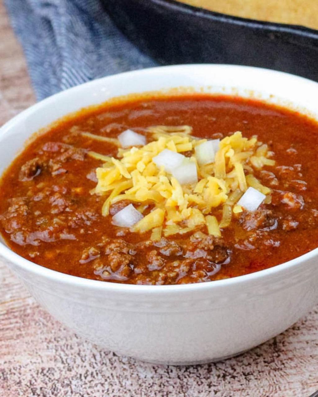4. Texas Chili with shredded cheese and onions on top.