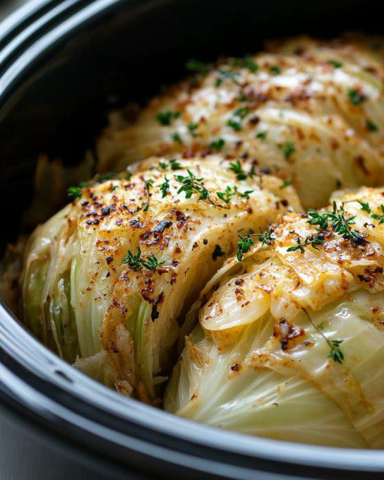 6. Once cooked, carefully remove the cabbage from the slow cooker and let it rest for a few minutes before slicing it into wedges.