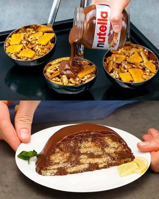 - Spread half of the Nutella-walnut mixture over the biscuit layer, pressing it gently to make sure it sticks.