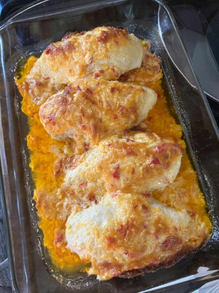 Assemble: Place chicken in the baking dish and top with pimento cheese mixture.