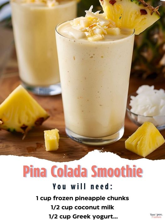 • In a blender, combine frozen pineapple chunks, coconut milk, Greek yogurt, honey (if using), vanilla extract, and ice cubes.