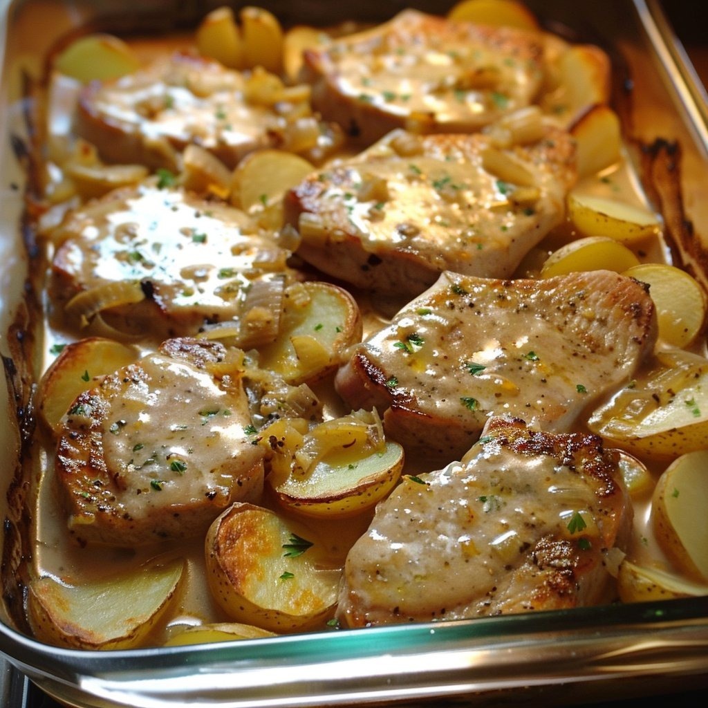 Easy, peasy and delicious! The creamy mixture adds a nice flavor the chops and potatoes. Give it a shot, you will like it