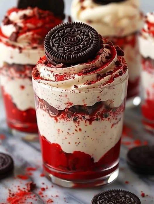 3. In serving glasses or bowls, layer red velvet cake crumbles, cheesecake filling, and crushed Oreo cookies.