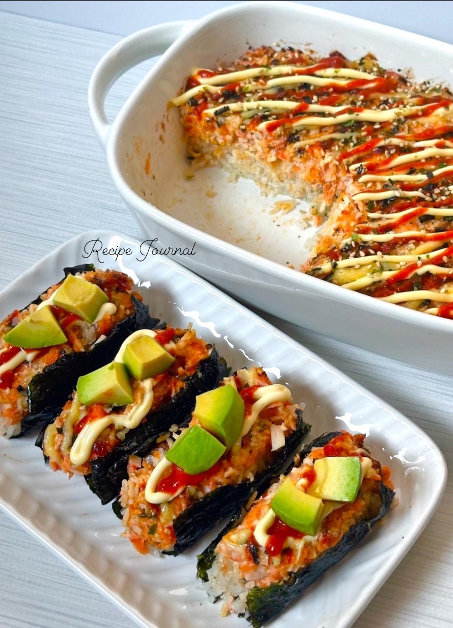 Remove from the oven allow it to cool 5 minutes then squeeze on more Sriracha, mayo, avocado and sesame seeds. Use nori paper or seaweed sheets to serve. Enjoy