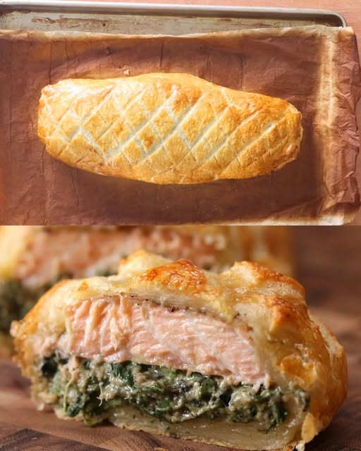 This Salmon Wellington combines flaky puff pastry, tender salmon, and a creamy spinach filling for a show-stopping dish. Perfect for dinner parties or a special family meal, this elegant recipe is surprisingly simple to prepare.