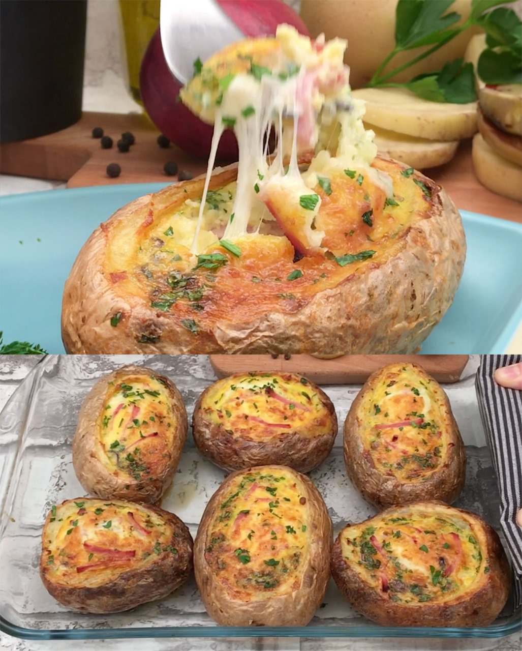 Final cooking : Place the stuffed potatoes in a gratin dish. Sprinkle with grated cheddar and bake again for 10 minutes at 170°C. Serve hot and enjoy.