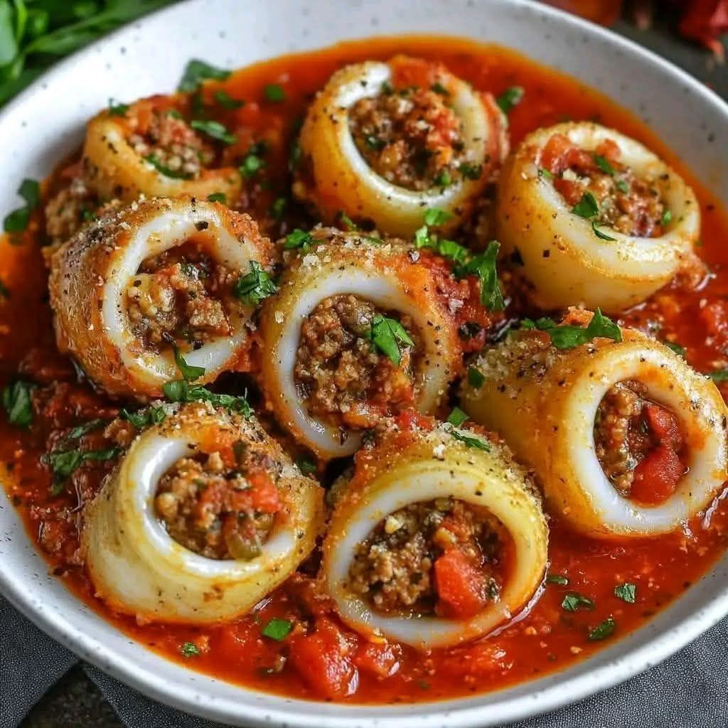 Then pour the tomato sauce into the skillet, cover and let cook on low heat for about 25-30 minutes, flipping the calamari to half-cooked so that they are evenly cooked.