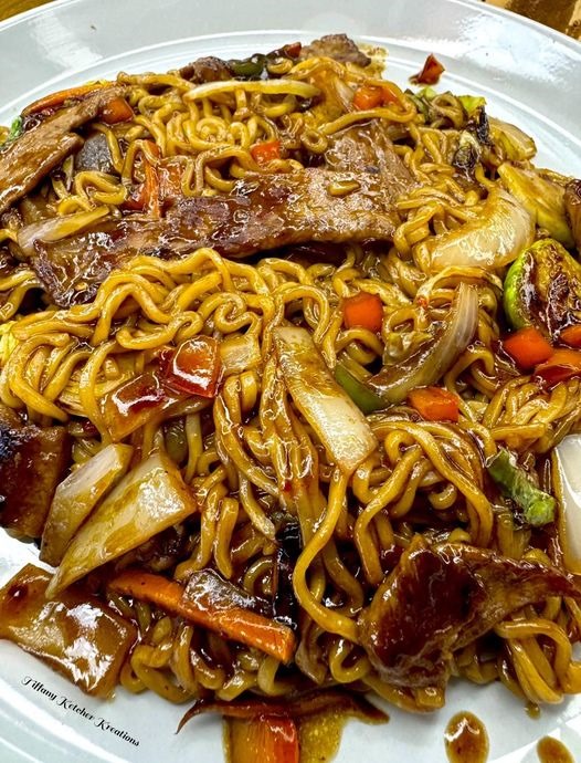 You may need to add a little more oil to pan and then add in veggies and cook a few minutes, add in shrimp and cook until they make a nice c shape, about 3 minutes and until vegetables are softened and slightly charred. Add sauce and steak to pan, allowing to thicken and then add in cooked ramen noodles and enjoy!