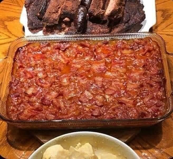 -Pour beans into the prepared baking dish and lay cooked bacon on top of the beans.