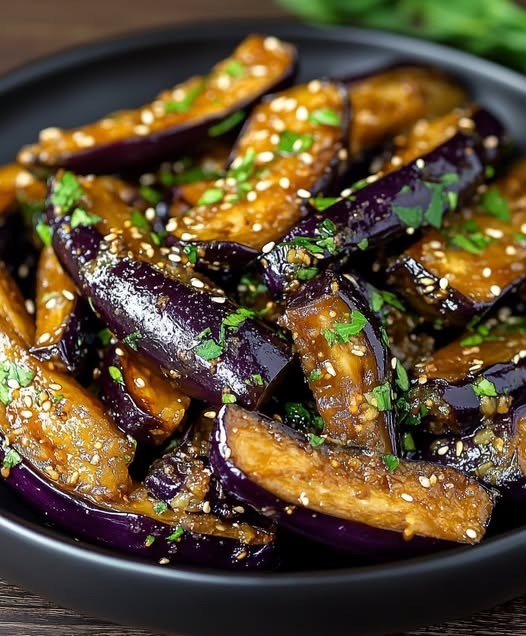 In a bowl, mix the chopped chili pepper, green onion, parsley, and garlic cloves. Add the vinegar, red pepper, soy sauce, olive oil, and sesame seeds. Mix well. Cut the eggplants into 4 pieces and place them in boiling salted water. Boil for 8 minutes over medium heat. Remove from the water and cut them into strips. Add the eggplants to the marinade, mix well, and refrigerate for 3 hours.